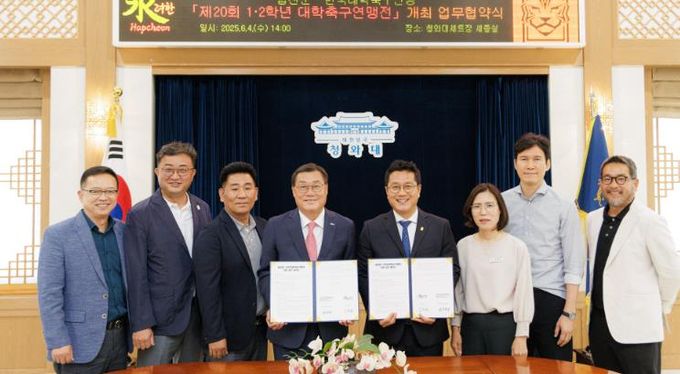 [경남도민뉴스=김춘호 기자] 합천군은 4일 합천영상테마파크 청와대 세트장에서 제20회 1․2학년 대학축구연맹전 유치협약식을 가졌다고 밝혔다.