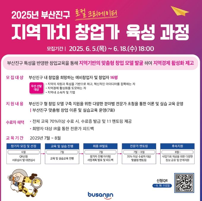 [경남도민뉴스=신석주 기자] 부산진구는 예비·초기창업자들에게 지역기반의 맞춤형 창업 모델을 발굴하기 위한 교육과정인 ‘2025년 부산진구 지역가치 차업가(로컬 크리에이터) 육성과정’ 교육생을 6월 5일부터 6월 18일까지 모집한다고 밝혔다.