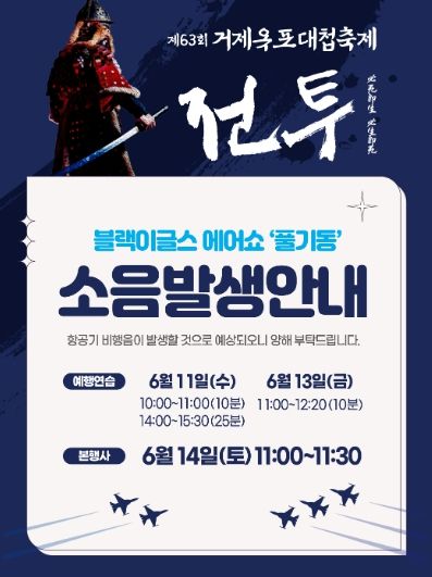 거제시 관계자는 “거제시민 및 인근 지역 시민들에게 비행소음 양해를 부탁드리며, 옥포수변공원 외에도 추천 관람스팟(△옥포(중앙)공원 △옥포대첩기념공원 △옥포조각공원)에서 블랙이글스 에어쇼를 마음껏 감상할 수 있으니 많은 관람 바란다”고 말했다.