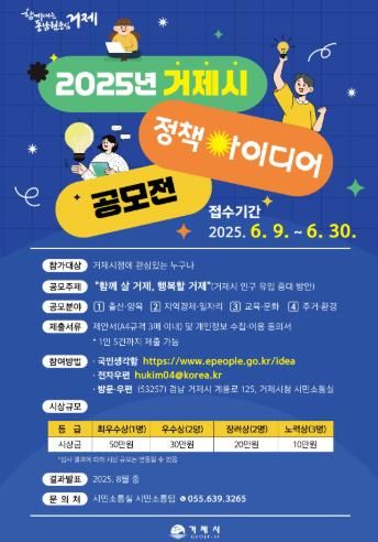 [경남도민뉴스=김부경 기자] 거제시는 참신하고 혁신적인 정책 아이디어를 발굴하기 위해 ‘2025년 거제시 정책 아이디어 공모전’을 개최한다고 밝혔다.