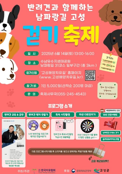 [경남도민뉴스=김태수 기자] 고성군은 오는 6월 14일 수남유수지 생태공원과 대독누리길 일원에서 ‘반려견과 함께하는 남파랑길 고성 걷기축제’를 개최한다고 밝혔다.