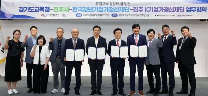 진주시와 진주 K-기업가정신재단은 9일 경기도교육청 남부청사에서 경기도교육청, 한국청년기업가정신재단과 K-기업가정신 확산과 창업 체험 및 교육 활성화를 위한 4자 간 업무협약(MOU)을 체결했다고 밝혔다.