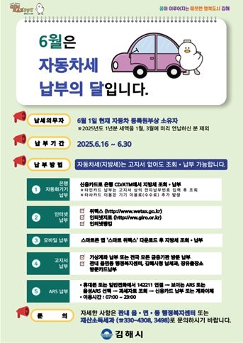 시 관계자는 “자동차세는 지방재정의 중요한 재원인 만큼 납부기한 내 납부해 주시기를 당부드리며 이달 말 납부기한을 넘길 경우 3%의 가산세가 부과되고 번호판 영치나 재산 압류 등 불이익이 발생할 수 있으므로 각별한 유의가 필요하다”며 “다양한 납세편의 시책으로 시민 중심의 세정서비스 제공에 최선을 다하겠다”고 밝혔다.