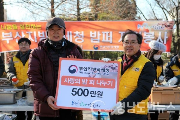 또한, 부산지방국세청 직원 60명과 사단법인 부산밥퍼 나눔 공동체는 추운 날씨 속에서 부산시청 녹음광장에 모인 어려운 이웃 500명에게 배식 봉사를 했다.