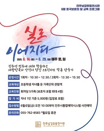 본 프로그램은 호국보훈의 달을 맞이하여 역사적 사실을 기반으로 한 교육 프로그램으로 호국보훈의 의미를 배우고 진주성 전투 역사에 대한 수업을 들은 후 태극기, 무궁화, 한반도 모양의 스트링아트 작품을 만들 예정이다.
