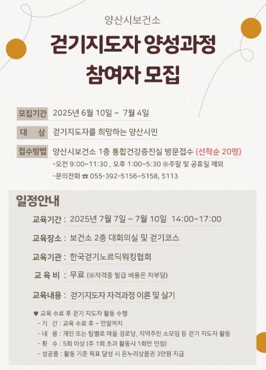 [경남도민뉴스=최미정 기자] 양산시는 주민 주도형 걷기 활성화 사업의 일환으로 ‘걷기지도자 양성 과정’참여자를 7월 4일까지 모집한다고 밝혔다.
