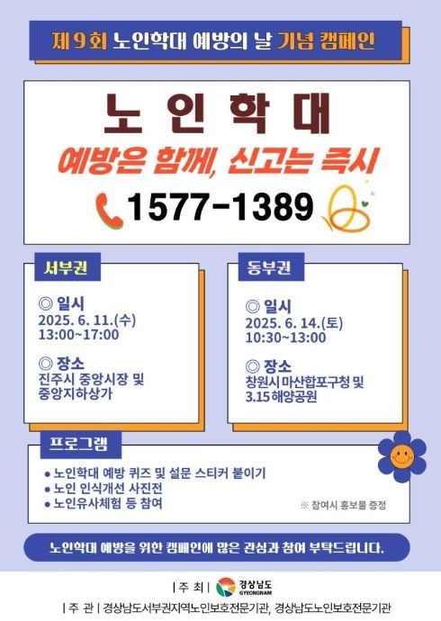 [경남도민뉴스=구인애 기자] 경상남도는 오는 15일 ‘제9회 노인학대 예방의 날’을 맞아, 도민과 함께하는 인권존중 문화 조성을 위해 거리캠페인 및 세미나 등 기념행사를 추진한다고 밝혔다.