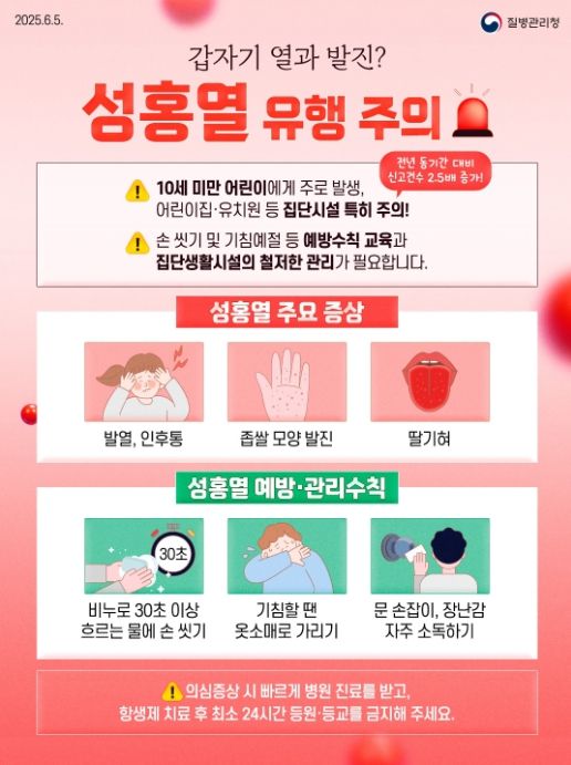 노혜영 경남도 감염병관리과장은 “성홍열은 조기발견 및 적절한 치료가 중요하다”면서, “고열이나 발진 등 의심 증상이 나타나면 신속히 의료기관을 방문해 진료받고, 손 씻기 등 개인위생 수칙을 철저히 지켜주시길 바란다”라고 당부했다.
