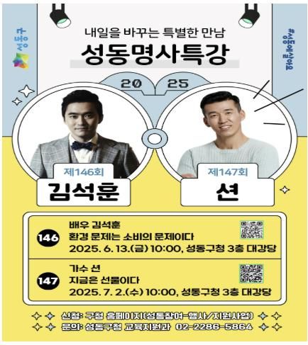 [경남도민뉴스= 기자] 서울 성동구가 오는 6월 13일, 7월 2일 2회에 걸쳐 구청 3층 대강당에서 2025년 상반기 ‘성동명사특강’을 개최한다.