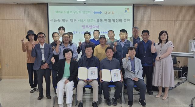 철원군은 최근 철원군농업기술센터에서 철원 러시멜로생산자 연합회(회장 윤종천)와 주식회사 다과원(대표 조성만)은 ‘러시멜로’의 안정적인 판로 확보 및 홍보를 위하여 '신품종 철원 멜론 ‘러시멜로’ 유통·판매 활성화 촉진 업무협약식'을 개최했다고 11일 밝혔다.