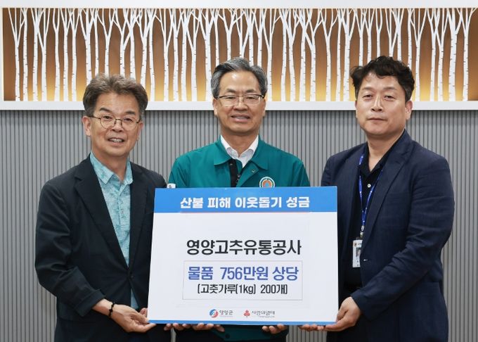 황찬영 영양고추유통공사 사장은 “이번 산불로 인해 피해를 입으신 주민분들에게 위로를 전하며, 전달된 물품이 주민들에게 작은 희망이 됐으면 좋겠다.”라며 “앞으로도 지역에 어려운 일이 있으면 나눔문화 확산을 위해 지역사회 공헌 활동을 지속하겠다.”라고 말했다.