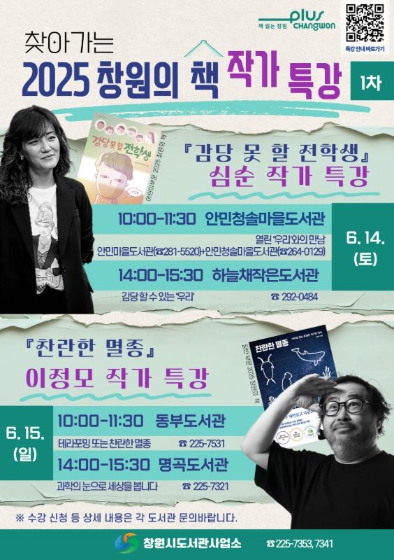 이번 특강은 ‘2025 창원의 책’으로 선정된 작가들이 창원시 공공도서관 및 작은도서관으로 직접 찾아가는 강연으로 △어린이 부문 선정도서 '감당 못 할 전학생' 심순 작가 △일반 부문 선정도서 '찬란한 멸종' 이정모 작가의 특강이 운영된다.