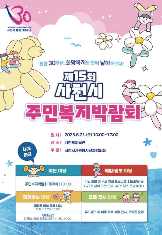 [경남도민뉴스=변정형 기자] 사천시는 지역의 다양한 주민복지서비스를 체험할 수 있는 제15회 사천시 주민복지박람회가 오는 21일 삼천포체육관 일원에서 열린다고 11일 밝혔다.