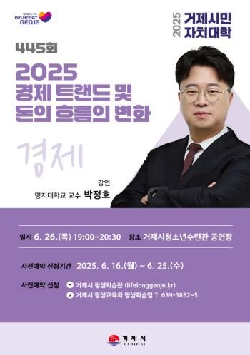 [경남도민뉴스=김부경 기자] 거제시는 6월 26일 거제시청소년수련관에서 명지대학교 박정호 특임교수를 초청해 ‘제445회 거제시민자치대학’을 개최한다고 밝혔다.