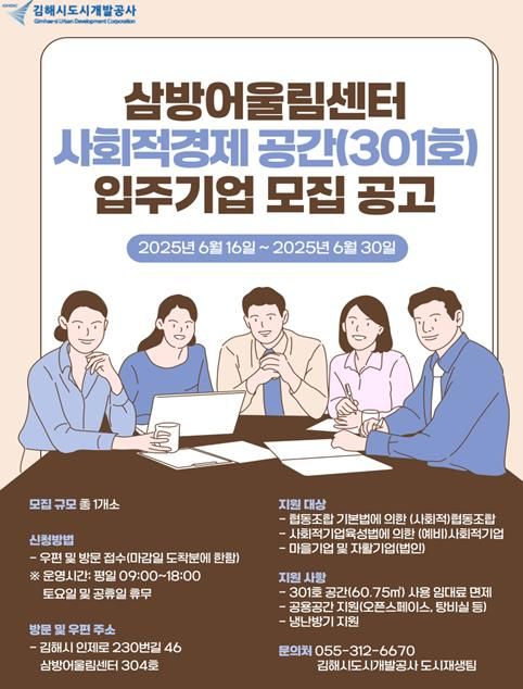 [경남도민뉴스=최미정 기자] 김해시도시개발공사는 삼방동 도시재생사업의 일환으로 조성된 삼방어울림센터 내 사회적경제 입주공간(1개소)에 대해 입주기업을 공개 모집한다고 밝혔다.