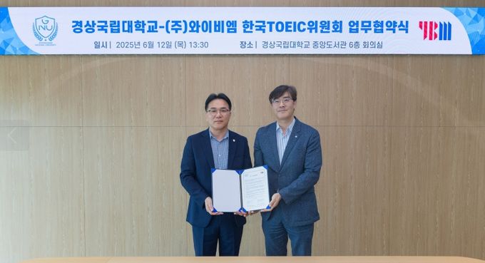[경남도민뉴스=구인애 기자] 경상국립대학교와 ㈜와이비엠 한국TOEIC위원회(회장 민선식)는 6월 12일 가좌캠퍼스 도서관 6층 회의실에서 재학생의 국제적 역량을 강화하기 위한 업무협약을 체결했다.