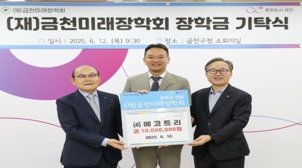 재활용 처리 전문기업 ㈜에코트리는 지난 5월 재단법인 금천미래장학회에 장학금 1,000만 원을 기탁했다. 장학금은 금천구 청소년의 교육을 지원하고, 미래 인재를 양성하는 데 사용될 예정이다.