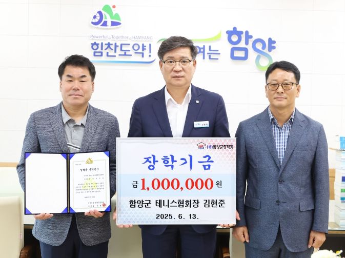 [경남도민뉴스=장광동 기자] 재)함양군장학회는 함양군테니스협회 김현준 회장이 지역 인재 육성을 위해 써달라며 장학금 100만 원을 기탁했다고 13일 밝혔다.