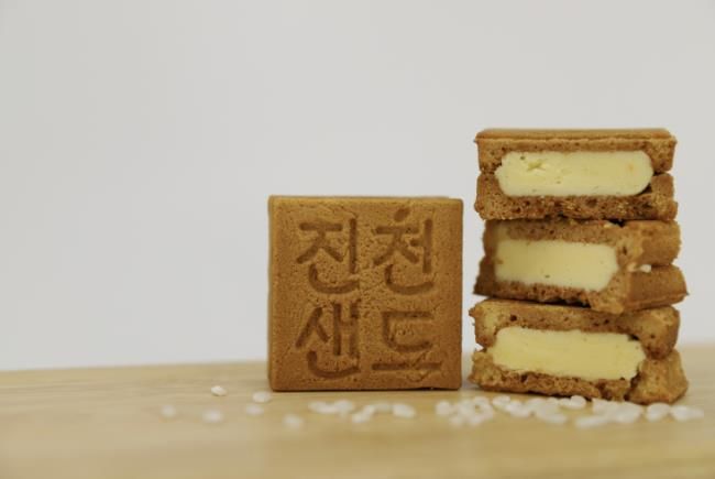 진천샌드는 쌀맛, 딸기맛, 멜론맛 등 3가지 맛으로 선보이고 있다.