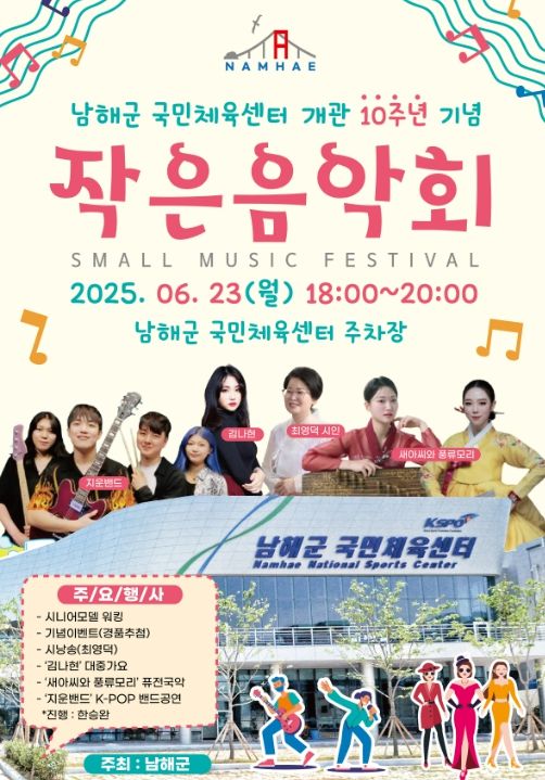 [경남도민뉴스=김부경 기자] 남해군은 오는 23일 저녁 6시 국민체육센터 주차장에서 센터 개관 10주년을 기념하는 작은음악회를 개최한다고 밝혔다.