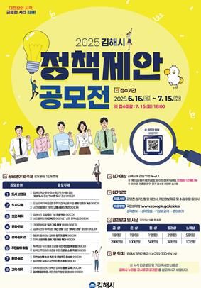 [경남도민뉴스=최미정 기자] 김해시는 행정 중심의 사고에서 벗어나 시민의 창의성과 실용적 감각이 담긴 정책 아이디어를 발굴하고자 ‘2025년 김해시 정책 제안 공모전’을 개최한다고 16일 밝혔다.