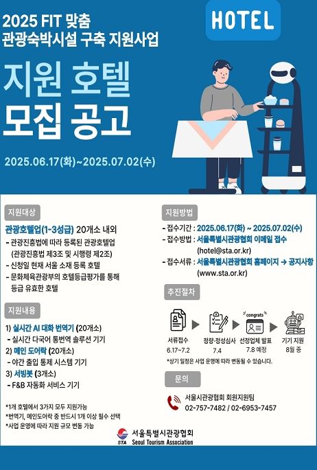[경남도민뉴스=백형찬 기자] 서울시와 (사)서울시관광협회가 ‘FIT 맞춤 스마트 관광숙박시설 구축 지원사업’에 참여할 서울 소재 중소형 관광호텔(1성급~3성급) 20여개를 6월 17일 부터 7월 2일까지 공개 모집한다.