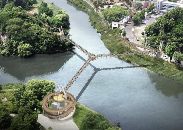 민선8기 출범 이후 남한강 친수공간 구상을 추진해 지난해 7월 군 대표단을 꾸려 경상남도 거창군을 방문, 항노화 힐링랜드의 Y자형 출렁다리를 시찰한 뒤 한강유역환경청 등 관련 기관과 지속적인 업무협의를 진행해 올해 1월 하천점용허가를 완료했다. 내년 초에 완공예정이며 공사가 마무리되면 다리는 한강의 자연경관을 감상하며 3개 섬을 둘러볼 수 있는 중심지 역할을 수행할 것으로 기대된다.