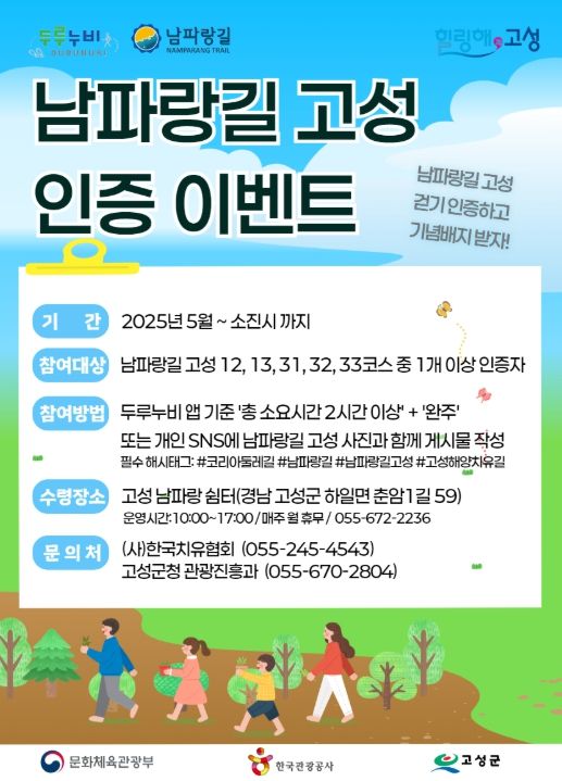 참여 방법은 간단하다. 남파랑길 고성 5개 구간 중 1개 이상 코스를 2시간 이상 걷고 완주한 후, 두루누비 앱에서 인증하거나, 개인 SNS에 고성 남파랑길에서 촬영한 사진을 필수 해시태그와 함께 업로드하면 된다.