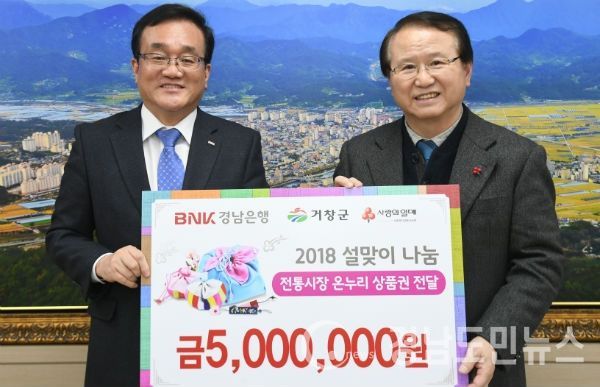 (거창/최병일) = BNK 경남은행 거창지점(지점장 임만길)이 지난 29일 거창군청을 방문해 설 명절을 맞아 관내 저소득층에게 전달해 달라며 온누리 상품권 500만 원을 기탁했다.