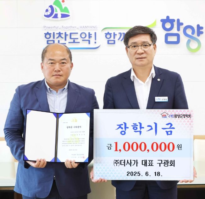 [경남도민뉴스=장광동 기자] (재)함양군장학회는 6월 18일, 서상 남덕유산 벚꽃축제 위원회 정진덕 위원장이 200만 원, ㈜더사가 구광회 대표가 100만 원의 장학금을 기탁했다고 밝혔다.