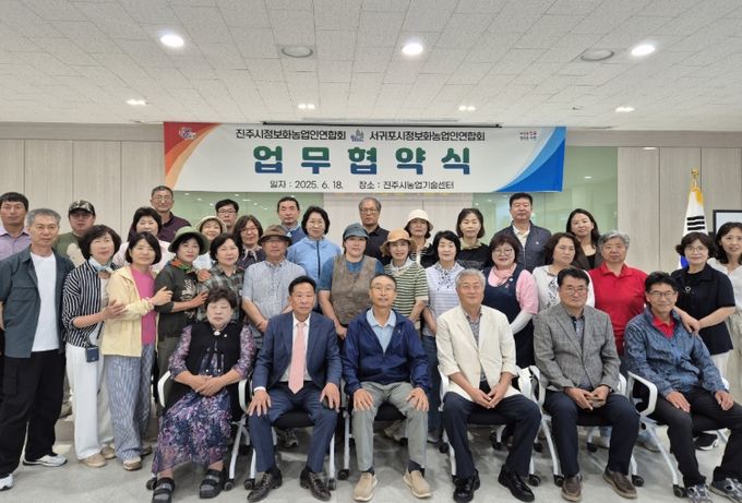 [경남도민뉴스=권중환 기자] 진주시정보화농업인연합회(회장 이근원)는 18일부터 19일까지 진주시를 방문한 서귀포시정보화농업인연합회(회장 양인호)와 양 단체 간 정보 교류와 농특산물 및 관광자원 홍보 등을 통한 농가소득 향상 및 지속 가능한 농업발전을 도모하기 위한 온라인쇼핑몰 공유 협약식을 가졌다.