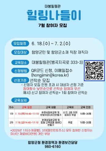 힐링나들이 프로그램은 함양군민과 관내 직장인을 대상으로 진행되는 환경성질환 예방 및 스트레스 감소를 위한 프로그램으로, 6월 18일부터 7월 2일까지 신청자를 선착순 모집 중이다.