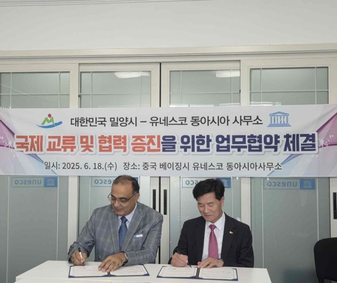 [경남도민뉴스=나희준 기자] 밀양시는 18일 중국 베이징시에서 유네스코 동아시아사무소(소장 사바즈 칸, Shahbaz Khan)와 공식 업무협약을 체결하며 유네스코 창의도시 지정을 위한 실질적인 국제협력 기반을 마련했다고 밝혔다.
