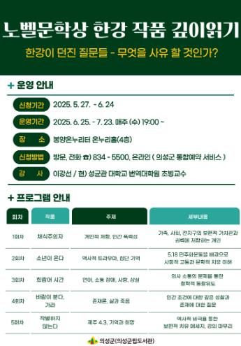[경남도민뉴스=장강동 기자] 의성군은 오는 6월 25일 오후 7시, 봉양온누리터도서관에서 노벨문학상 수상 작가 한강의 대표 작품을 함께 읽고 나누는 ‘한강 작품 톺아보기’를 운영한다고 밝혔다.