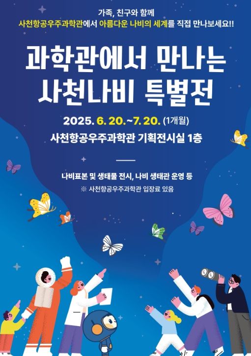 [경남도민뉴스=변정형 기자] 사천시는 계획공모형 지역관광개발사업의 일환으로 6월 20일부터 7월 20일까지 한 달간 사천항공우주과학관 1층 기획전시실에서 ‘과학관에서 만나는 사천나비 특별전’을 개최한다.