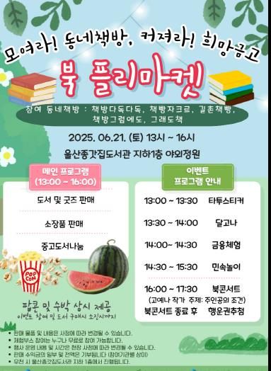 [경남도민뉴스=최재경 기자] 울산종갓집도서관이 HD현대중공업새마을금고, 지역 독립서점 5곳과 협력해 오는 6월 21일 오후 1시부터 5시 30분까지 울산종갓집도서관 지하 1층 야외정원 및 재미마루에서 ‘책 벼룩시장(북플리마켓)&작가와의 만남’ 행사를 개최한다.