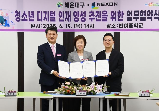 [경남도민뉴스=김채연 기자] 해운대구는 19일 오후 2시 반여중학교에서 ㈜넥슨코리아(대표 강대현 김정욱)와 ‘청소년 디지털 인재 양성 업무 협약’을 체결했다.