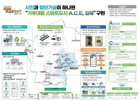 김해시는 ‘시민과 첨단기술이 하나된 기후대응 스마트도시 에이스(A.C.E), 김해’를 비전으로 ‘에이스(A.C.E) 전략’과 8개 실행과제를 수립해 공모에 선정됐으며 오는 2027년까지 3년간 총사업비 165억 원(국비 80억, 도비 16억, 시비 64억, 민간 5억 원)으로 사업을 추진한다.