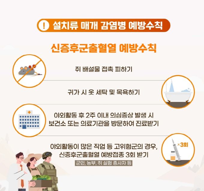 특히 6월〜7월 장마철은 설치류의 활동이 활발해지는 시기로, 야외 작업이나 캠핑 등에서 감염 가능성이 높아지는 시기이다.
