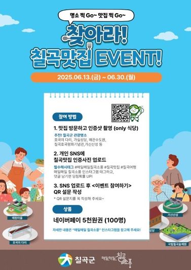추첨을 통해 총 100명 대상 모바일쿠폰을 경품으로 제공하며 이벤트에 대한 자세한 내용은 칠곡관광 SNS 계정 ‘매일매일 칠곡소풍’에서 확인할 수 있다.
