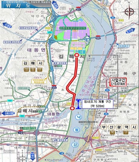 대동산단 진입도로는 전액 국비 사업으로 총 사업비는 687억원이다. 사업 규모는 총연장 3.61km에 2~4차로이며 대동화명대교 연결도로(램프)를 시점으로 낙동강 제방 옆 기존 도로 0.87km를 2차로에서 4차로로 확장하고 2.74km는 신설 구간이다. 시는 확장 구간과 신설 구간으로 구분해 공정을 추진 중이며 2024년 3월 착공 후 현재 공정률은 34%이다.