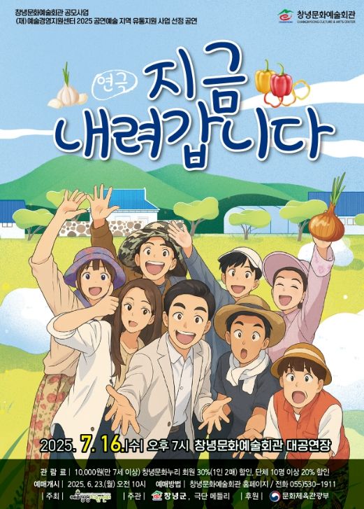 [경남도민뉴스=김병현 기자] 창녕군은 7월 16일 오후 7시 창녕문화예술회관 대공연장에서 귀농·귀촌을 주제로 한 연극 ‘지금 내려갑니다’를 선보인다고 밝혔다.