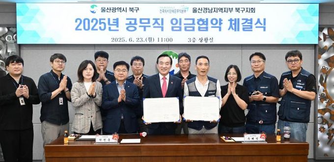[경남도민뉴스=최재경 기자] 울산 북구는 23일 구청 상황실에서 전국공공운수사회서비스노조 전국자치단체공무직본부 울산경남지역지부 북구지회와 2025년 임금협약을 체결했다.