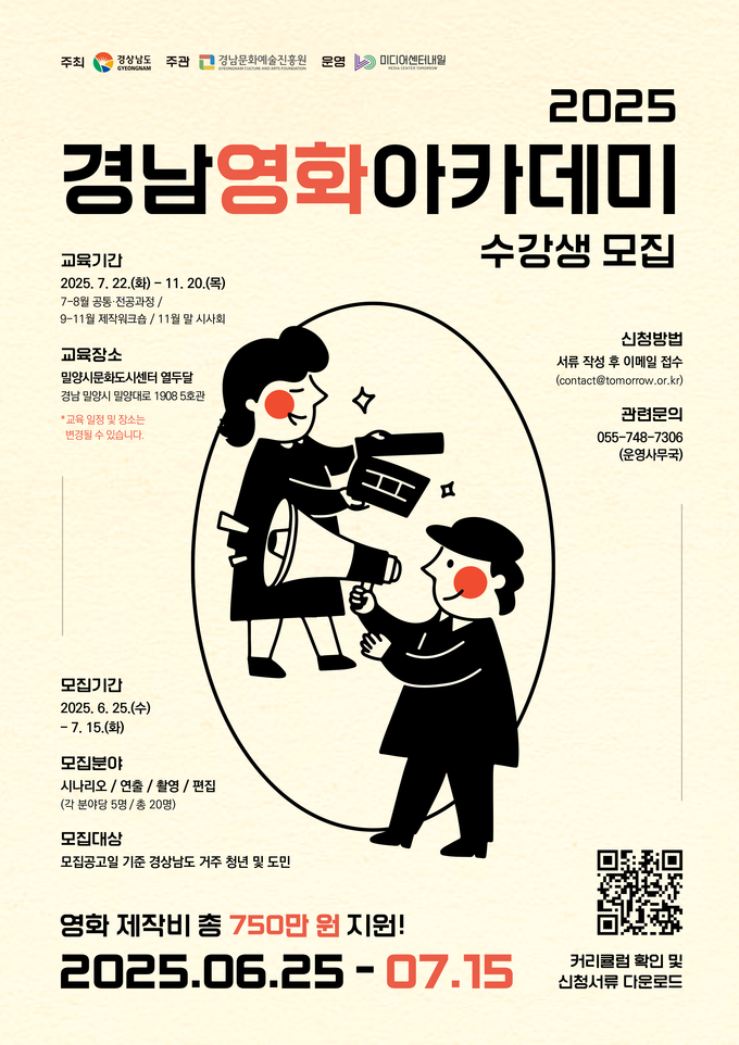 [경남도민뉴스=구인애 기자] 경상남도와 경남문화예술진흥원는 6월 25일부터 7월 15일까지 지역 영화·영상 전문 인재 양성을 위한 ‘2025년 경남 영화·영상 아카데미 수강생’을 모집한다고 밝혔다.