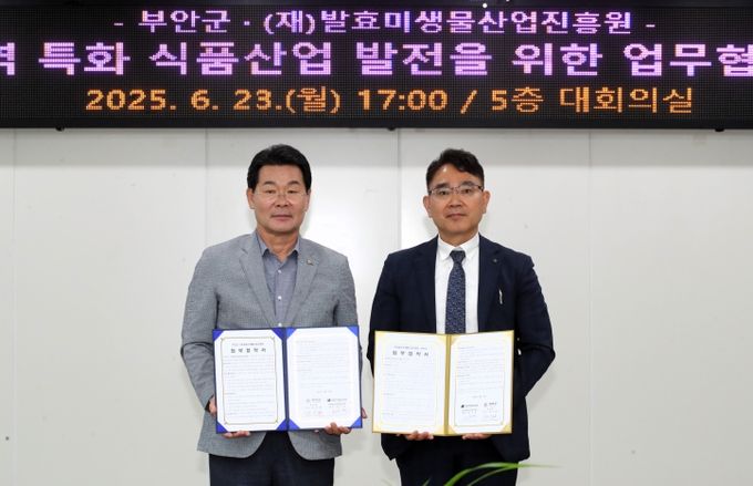 [경남도민뉴스=최인태 기자] 부안군은 6월 23일 (재)발효미생물산업진흥원과 지역 특화 식품산업 발전과 지역경제 활성화를 위한 업무협약을 체결했다고 밝혔다.