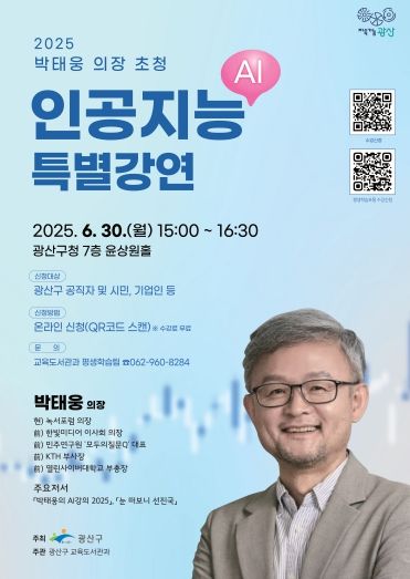 [경남도민뉴스=최현인 기자] 광주 광산구는 30일 오후 3시 구청 7층 윤상원홀에서 박태웅 녹서포럼 의장(‘AI 강의 2025’ 저자)을 초청해 ‘인공지능(AI) 특별강연’을 개최한다고 밝혔다.