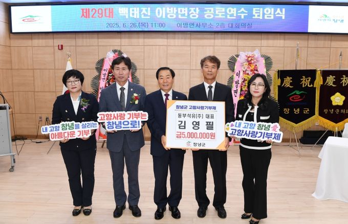 [경남도민뉴스=김병현 기자] 창녕군은 동부석유(주) 김영필 대표가 지난 26일 고향사랑기부제에 동참하며 500만 원을 기탁했다고 밝혔다.