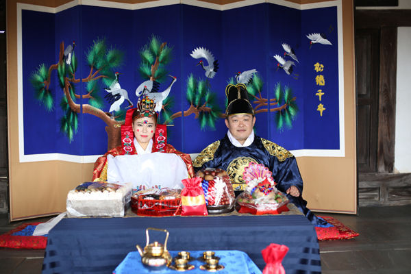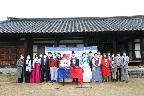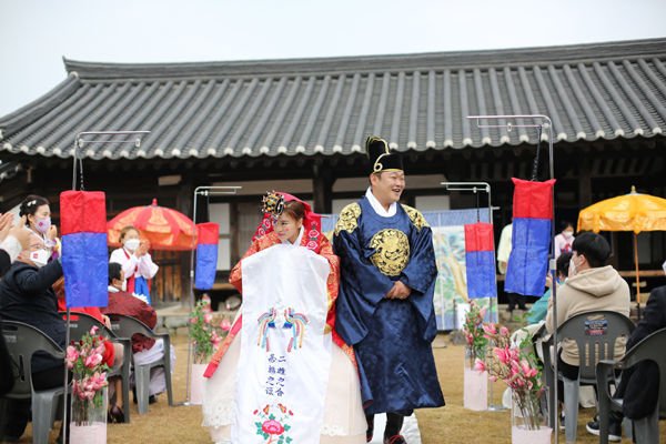 코로나19 확산 방지를 위해 철저한 방역수칙을 준수한 가운데 진행된 이날 전통혼례는 사대관모를 차려입은 신랑과 연지곤지를 찍고 족두리로 치장 한 신부가 전통혼례 순서에 따라 혼례를 통해 백년가약을 약속하며 평생 잊지 못할 아름다운 추억을 만들었다.