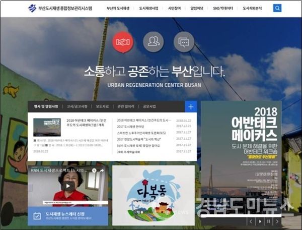 부산시는 금일부터 도시재생사업에 대한 정보 공유와 체계적 사업관리를 위한 '부산 도시재생 종합정보관리시스템'을 본격 운영한다고 밝혔다.