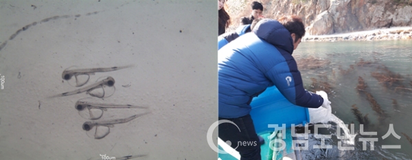 이번에 방류하는 대구 종자는 9mm 내외의 어린 대구로 올해 1월 가덕도 인근해역에서 잡힌 어미 대구로부터 알을 얻어 약 20일 간 연구소에서 키운 것이다.